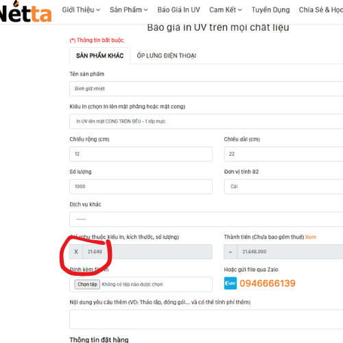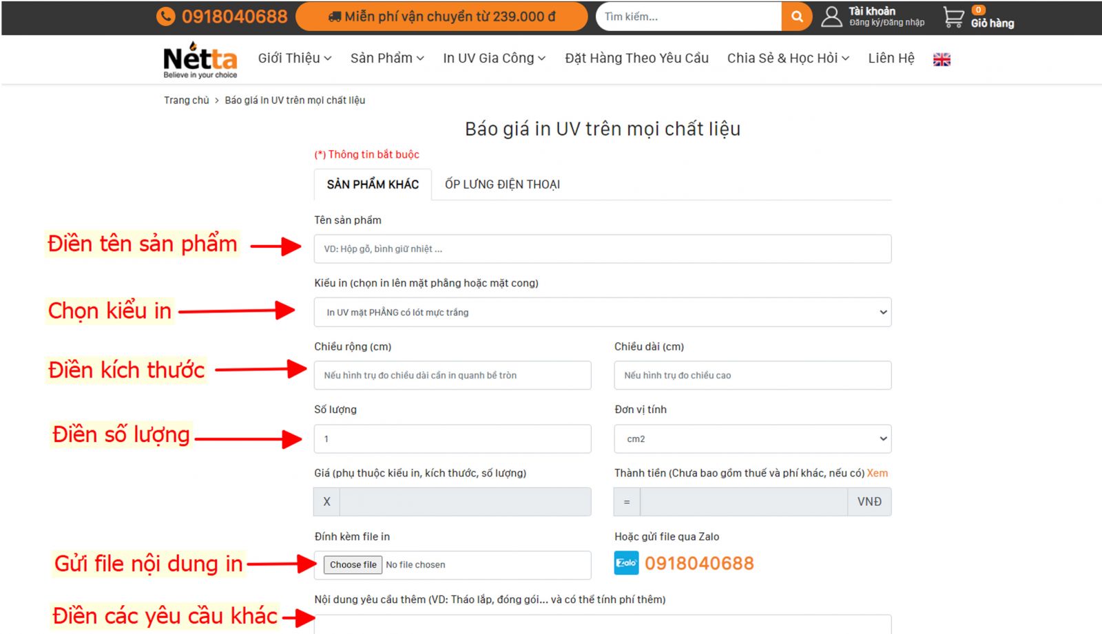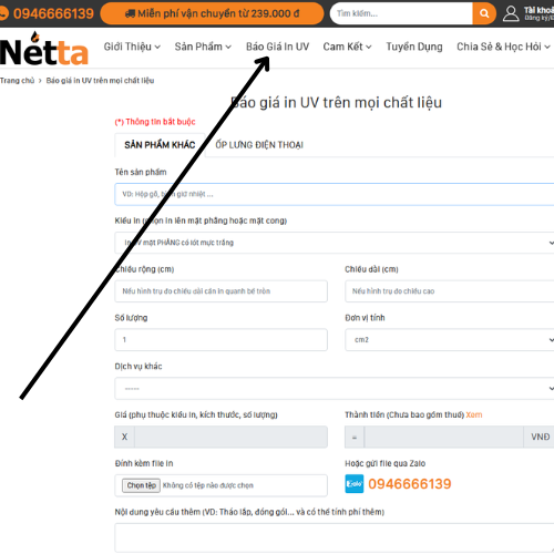 Bước 2: Sau khi vào được website, anh chị mình chọn vào báo giá in uv như hình.